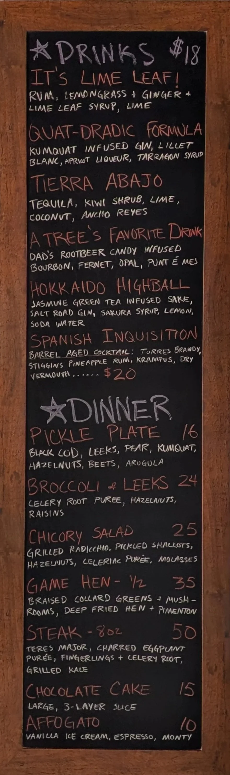 Charred Leek infused Tequila, Coffee Liquor, Fino Sherry, Tarragon, Campari, Chicory Pecan Bitters
